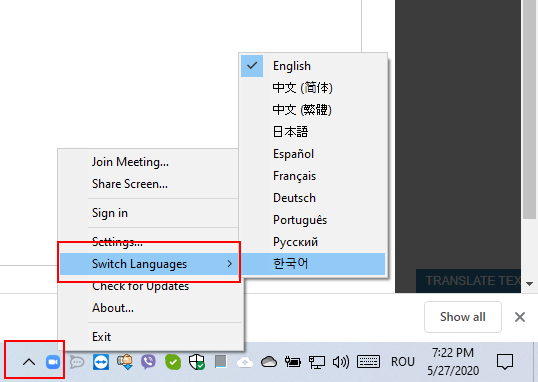 Pentru a schimba limba de interfață faceți clicul drept pe iconița aplicației care se află în colțul drept jos: