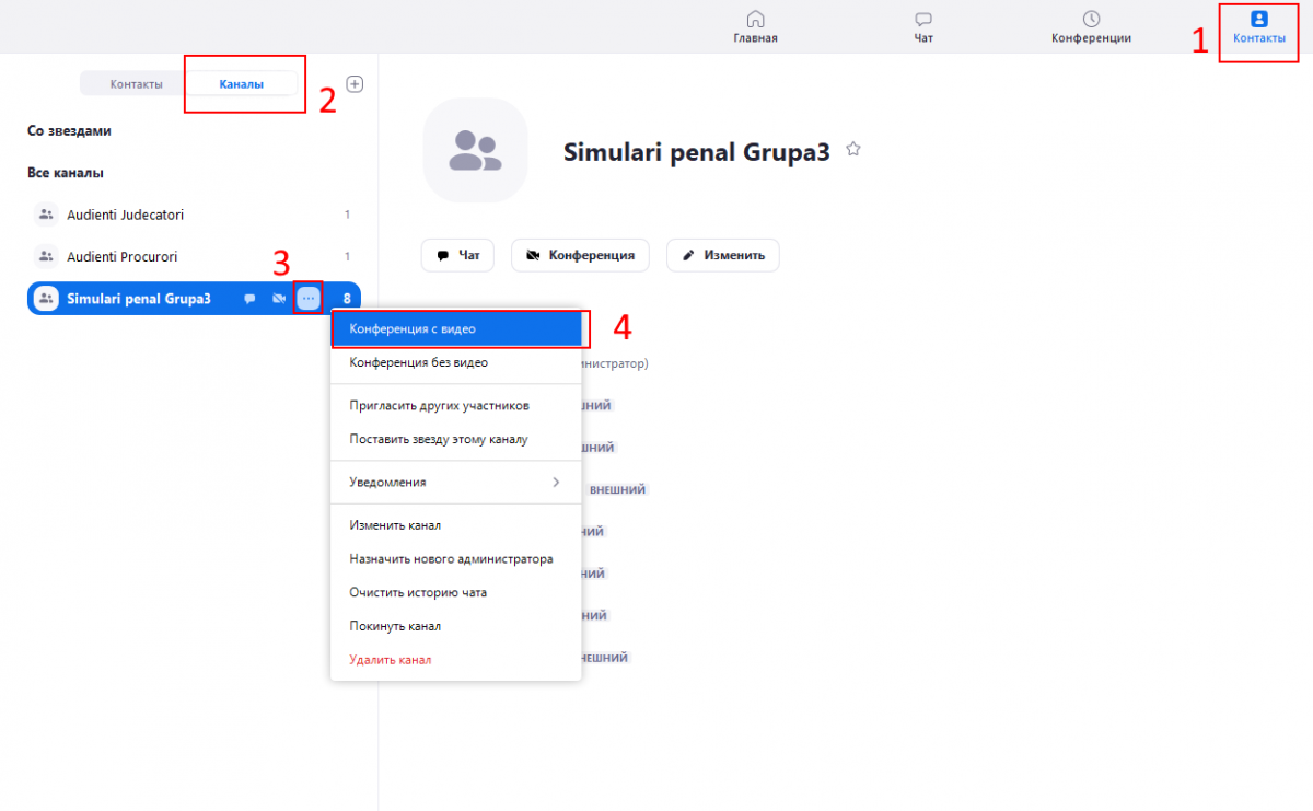 Deschideți Контакты->Каналы->Selectați grupa respectivă->Apasați butonul cu 3 puncte->Конференция с видео. La orice intrebarea de a folosi Sunetele calculatorului sau Videoamera răspundeți afirmativ (raspunsul afirmativ, de obicei, este butonul albastru)