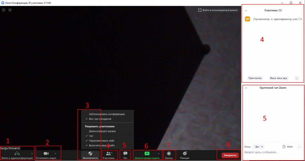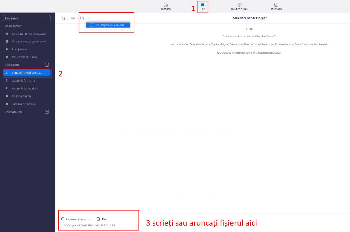 Acest chat și chat-ul grupei sunt 2 chat-uri diferite. Nu folosiți acest chat, deoarece dupa sfîrșitul videoconferintei istoria mesajelor și fișierile transmise prin acest chat nu vor fi disponibile. Utilizați chat-ul grupei descris la punctul 5.