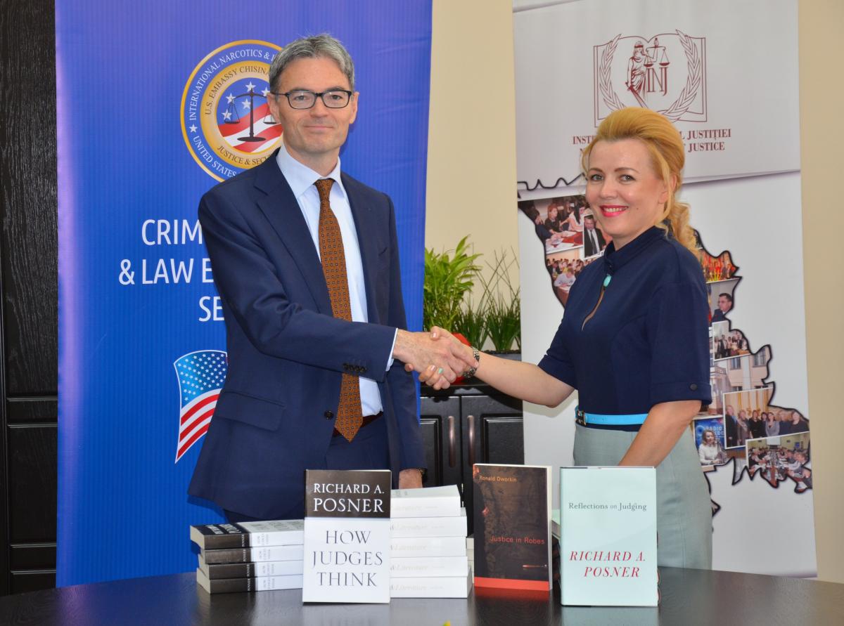 The Director of the National Institute of Justice, Diana Scobioala, has thanked the guests for the donated volumes, mentioning that they will be very useful for the NIJ trainees, judges, prosecutors and for other categories of beneficiaries that attend the NIJ’s trainings. The five titles, signed by American authors, comprise reflections on the judicial process, interpretation of law, judicial ethics, judges’ way of thinking etc.