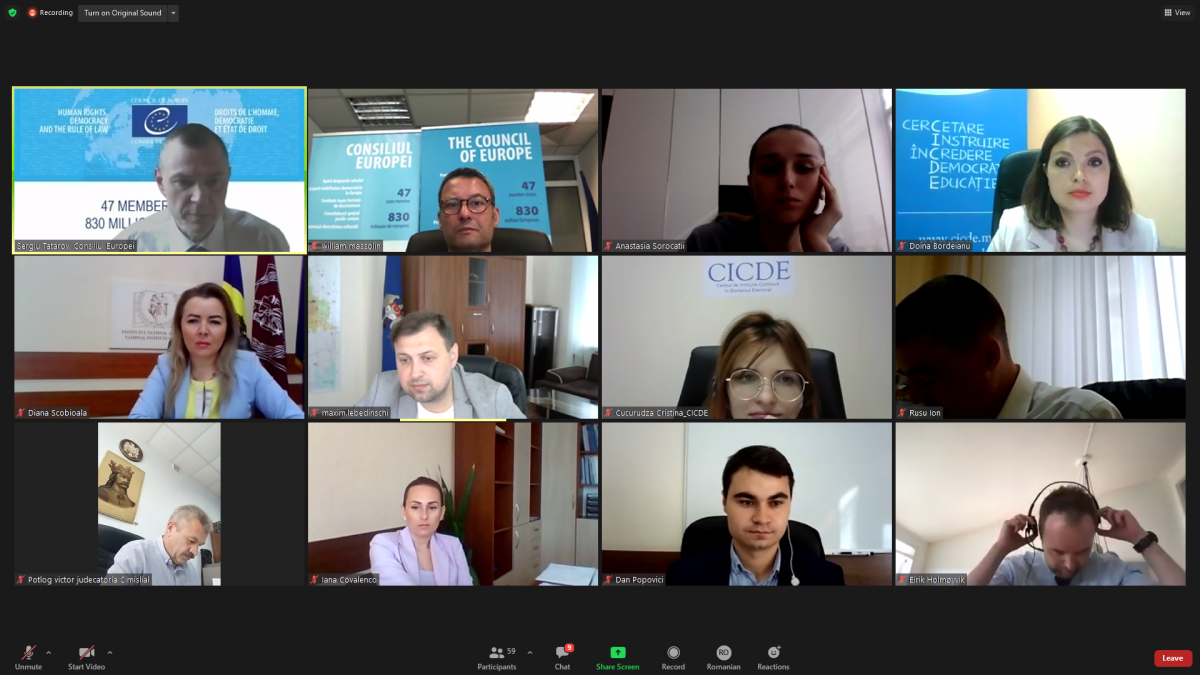 "Examination and settlement of electoral disputes by courts in the Republic of Moldova" was the subject of the seminar held online today, May 28, 2021, for judges specializing in administrative litigation at the Supreme Court of Justice and courts of appeal. The event was organized by the National Institute of Justice in partnership with the Council of Europe, the Central Electoral Commission and the Center for Continuous Training in the electoral field.