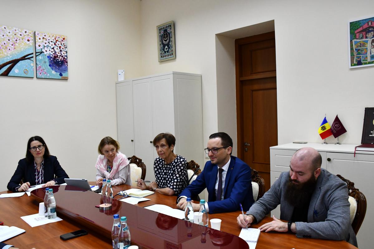 A delegation of the Federal Ministry of Justice from the Federal Republic of Germany, conducted by Benjamin Strasser, parliamentary state secretary, is, these days, on an official visit to Chisinau. On Thursday, 23 May 2024, accompanied by H.E. Margaret Maria Uebber, Extraordinary and Plenipotentiary Ambassador of the Federal Republic of Germany to the Republic of Moldova, members of the delegation - Nicolas Hellmuth, personal assistant, Anne Zimmermann, Head of the International Legal Cooperation Department, Alexandra Albrecht, General Director of the German Foundation for International Legal Cooperation (IRZ), had a meeting with the Ad interim Director of the National Institute of Justice, Adrian Cerbu, and Olga Marandici, advisor to the Director of the NIJ, head of the International Relations Section.