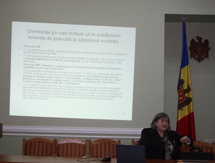 Raisa BOTEZATU, vicepreşedinte al Curţii Supreme de Justiţie, formator naţional în domeniul justiţiei juvenile, a luat în dezbatere teme referitoare la: Legislaţia naţională procesual-penală şi conformitatea acesteia cu standardele internaţionale şi la Particularităţile judecării cauzelor penale în care sunt implicaţi minori.